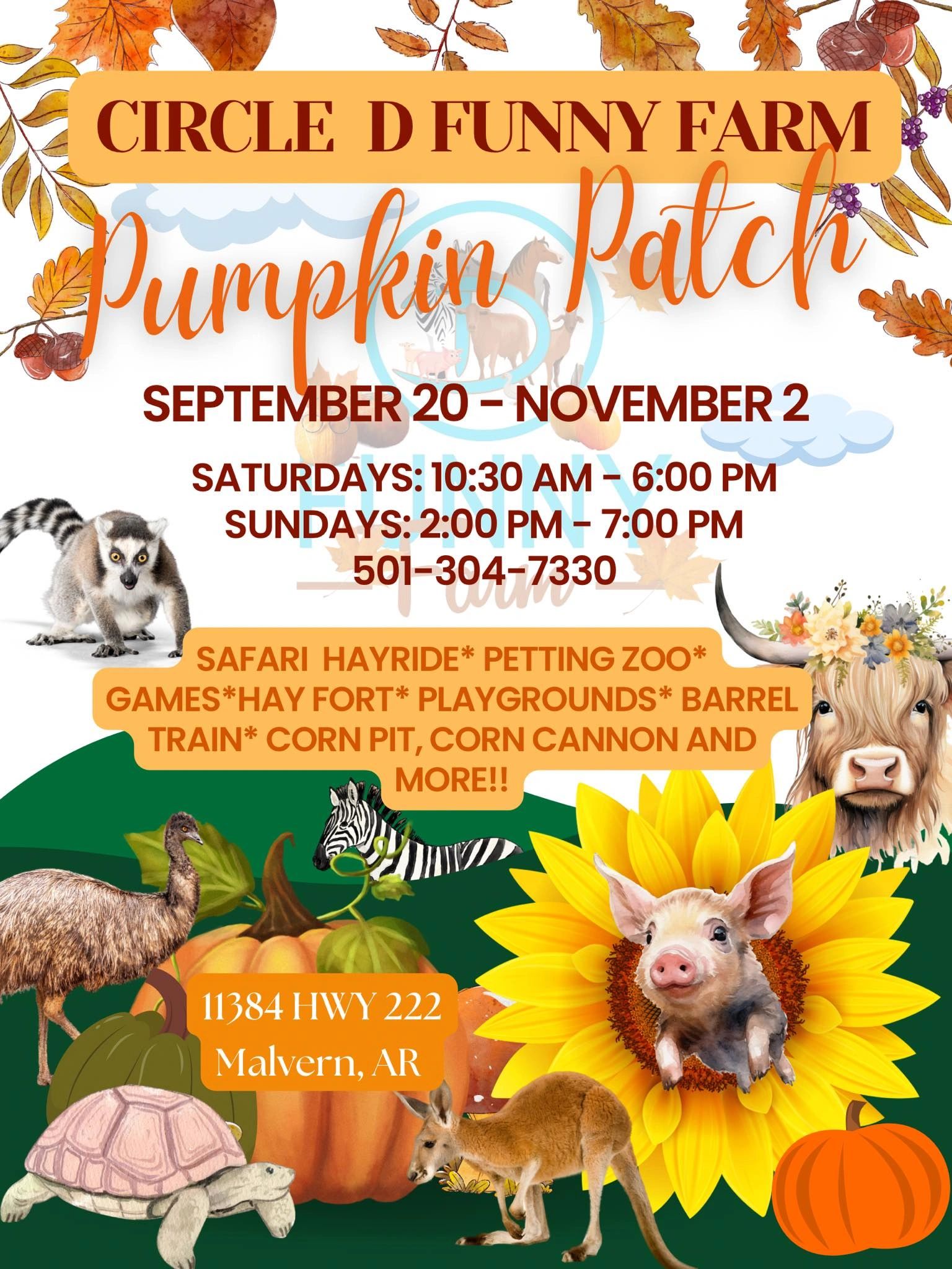 Get ready for fall fun at Circle D Funny Farm! 🍁 Our Annual Pumpkin Patch opens to the public weekends only from September 20 – November 2, 2025!